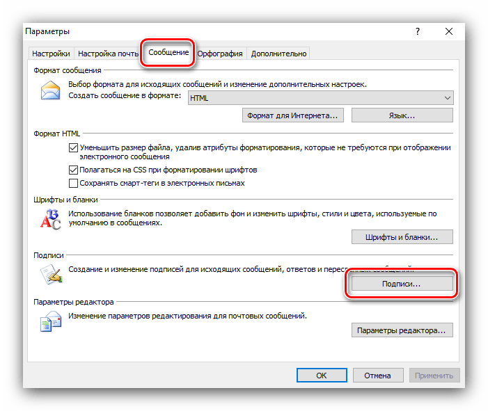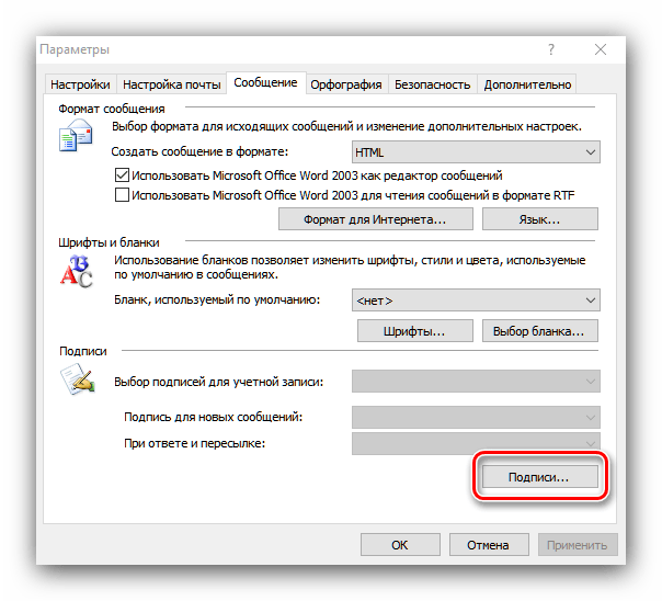 2. В открывшемся окне перейдите на вкладку «Сообщения». Найдите раздел «Подписи сообщений» и нажмите соответствующую кнопку.