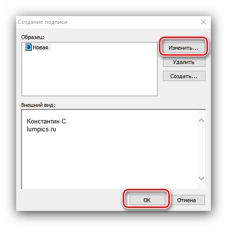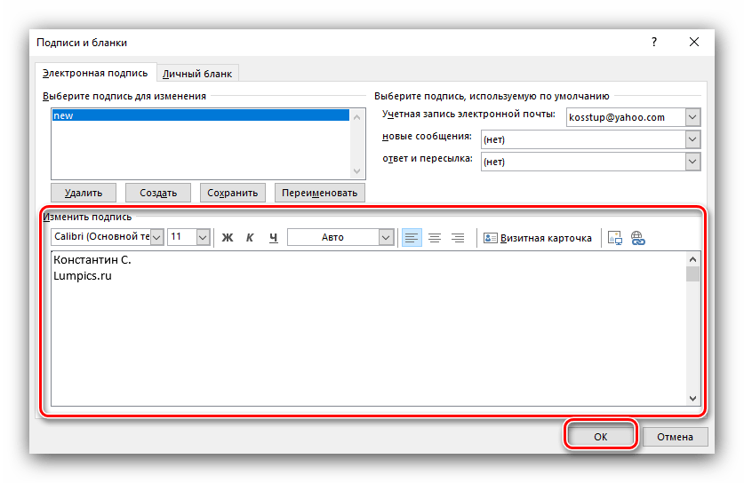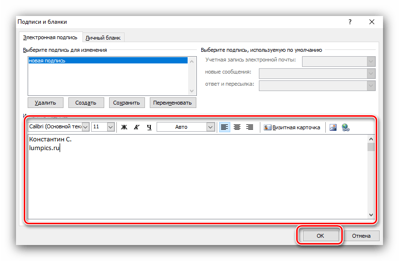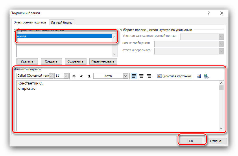 3. Интерфейс создания подписи аналогичен более новым версиям. Нажмите «Создать» и введите название подписи. В нижней части окна введите текст подписи. При необходимости добавьте форматирование. Подтвердите изменения кнопкой «ОК».