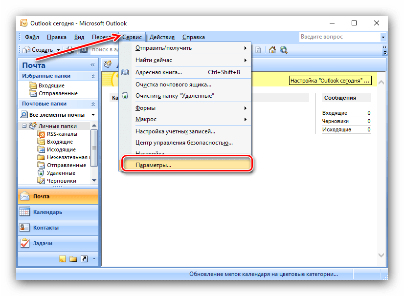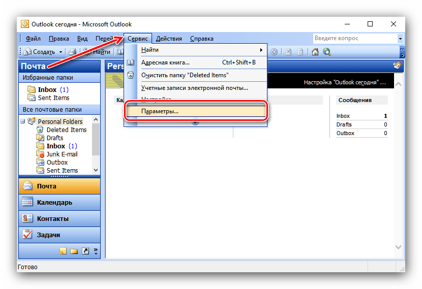 1. Открытие параметров программы. Запустите Outlook 2003 и в верхнем меню выберите раздел «Сервис», затем пункт «Параметры». Это основное меню настроек приложения.