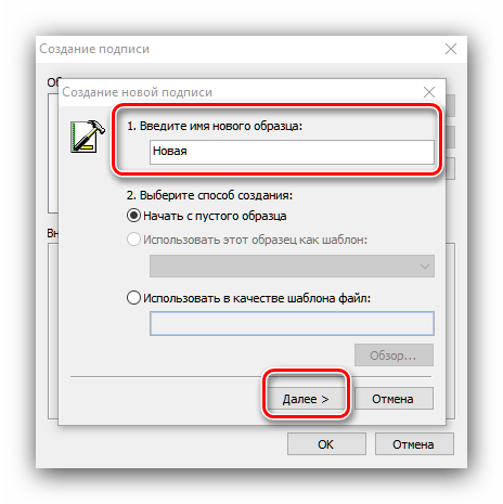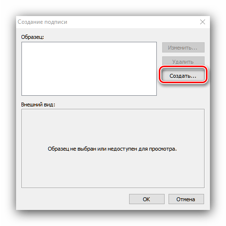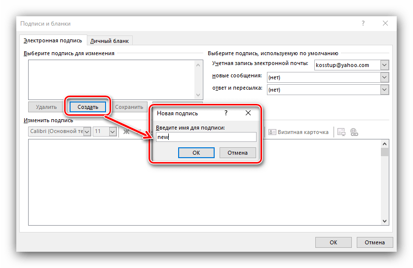 3. В появившемся диалоговом окне нажмите «Создать», введите название для вашей подписи (например, «Рабочая» или «Личная») и подтвердите создание.