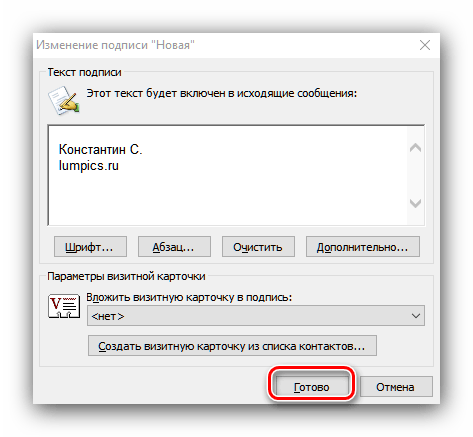 После завершения редактирования нажмите «ОК», теперь подпись будет автоматически добавляться в новые сообщения.