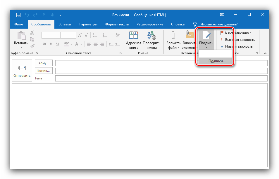 - Открытие меню подписей. В открывшемся окне письма раскройте раздел «Сообщение», найдите пункт «Подпись»и выберите «Подписи…».