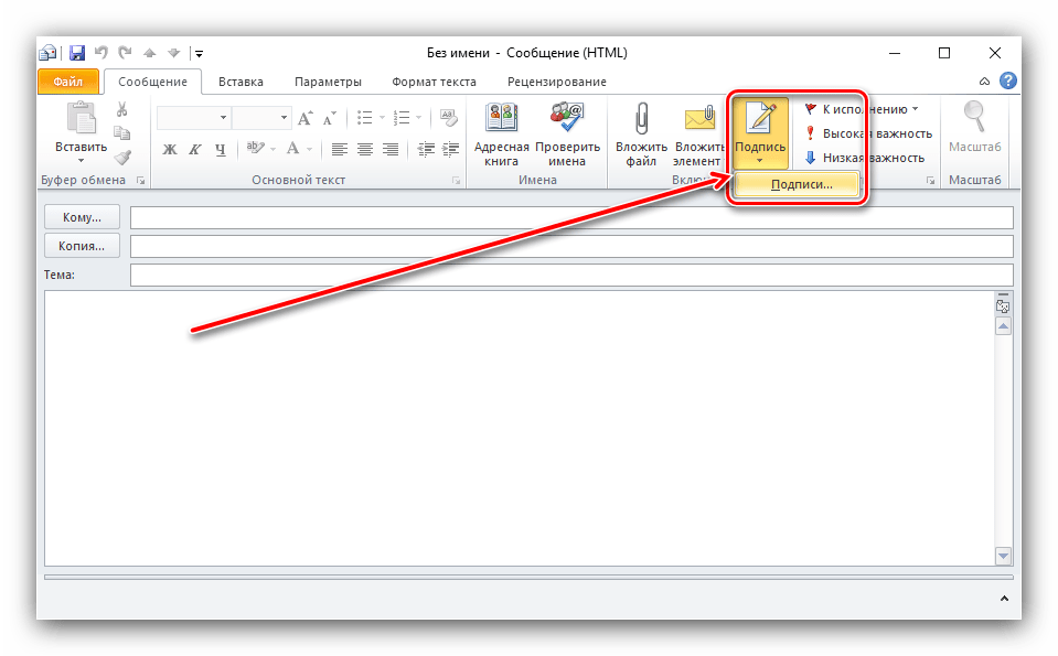 2. В открывшемся окне письма найдите вкладку «Сообщение», где расположена кнопка «Подпись». В выпадающем меню выберите пункт «Подписи».