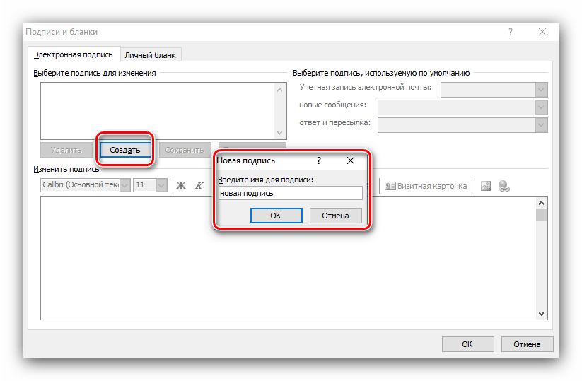 - Создание новой подписи. В появившемся окне нажмите «Создать»и введите название подписи (например, «Рабочая»или «Личная»).