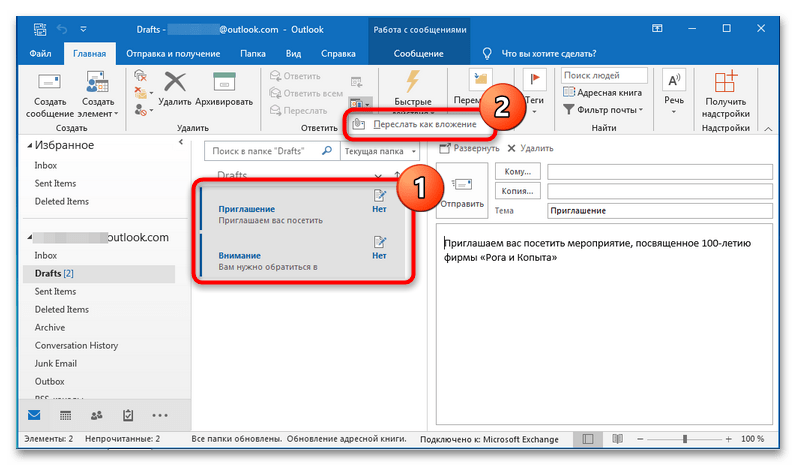 - Процедура выбора сообщений. Перейдите в раздел с нужной корреспонденцией. Отметьте необходимые письма (используйте Ctrl для множественного выбора). Во вкладке «Главная» отыщите блок «Ответить». Нажмите на стрелочку возле кнопки «Дополнительно». В появившемся списке выберите «Переслать как вложение».