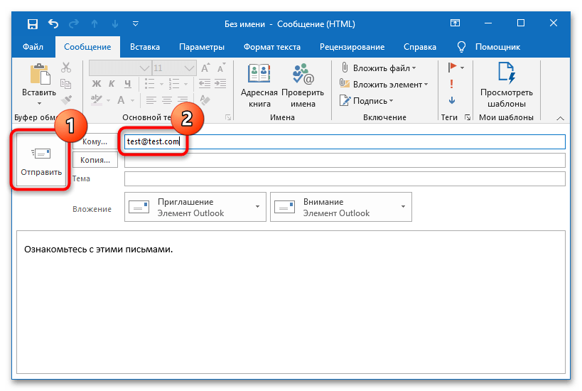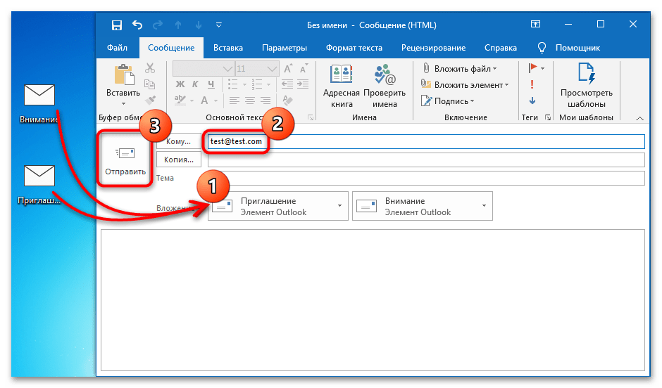- Прикрепление файлов. Откройте директорию с сохраненными файлами .msg. Переместите их в область нового письма. Запасной вариант – использование кнопки «Прикрепить файл». Заполните обязательные поля и выполните отправку.