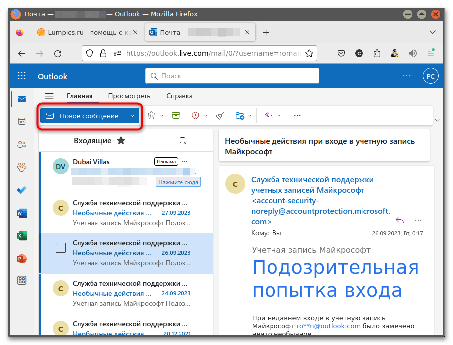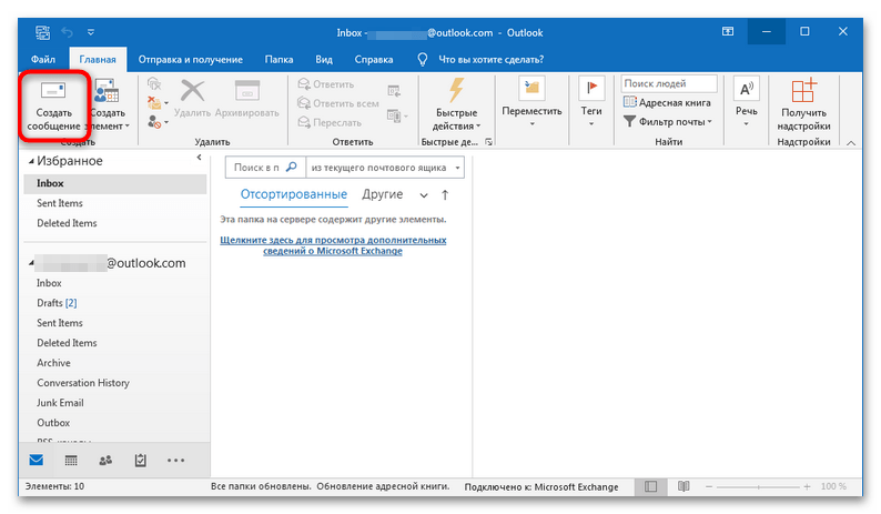 - Инициализация процесса. Выполните вход в веб-интерфейс Outlook. Перейдите в раздел с нужной корреспонденцией. Кликните «Новое сообщение» для создания письма.