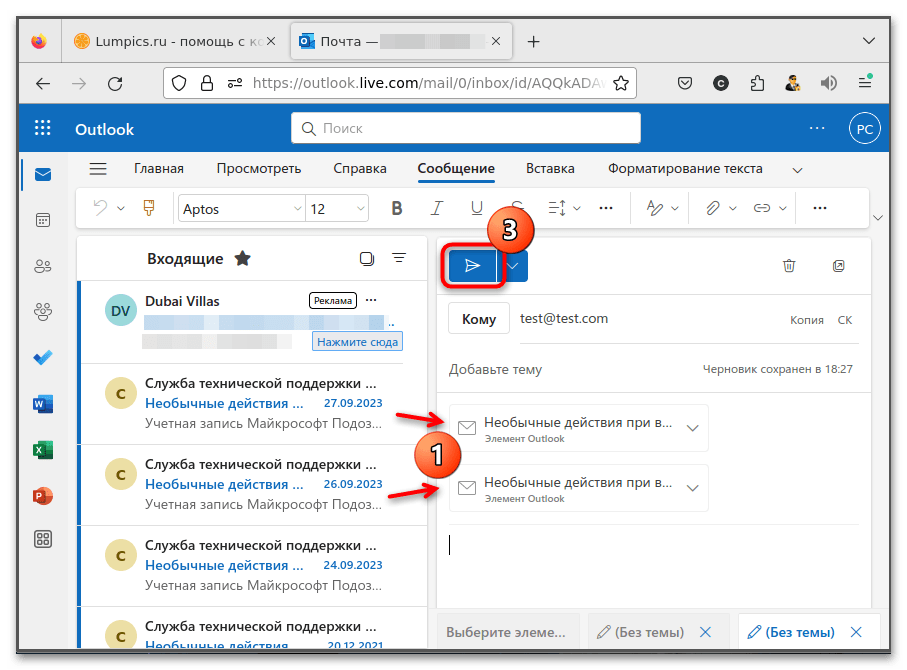 - Завершающий этап. В новом окне составления письма отобразятся прикрепленные сообщения. Заполните обязательные графы: «Получатель», «Тема». При желании добавьте пояснительный текст. Для завершения процесса кликните «Отправить».